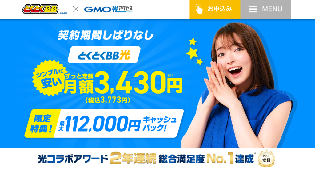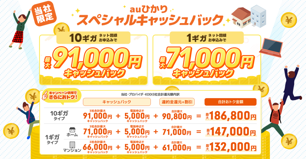 | キャンペーン | ・新規の方は40,000円キャッシュバック ・工事費実質無料 ・あんしん乗り換えキャンペーンで、満額還元 (最大100,000円) |