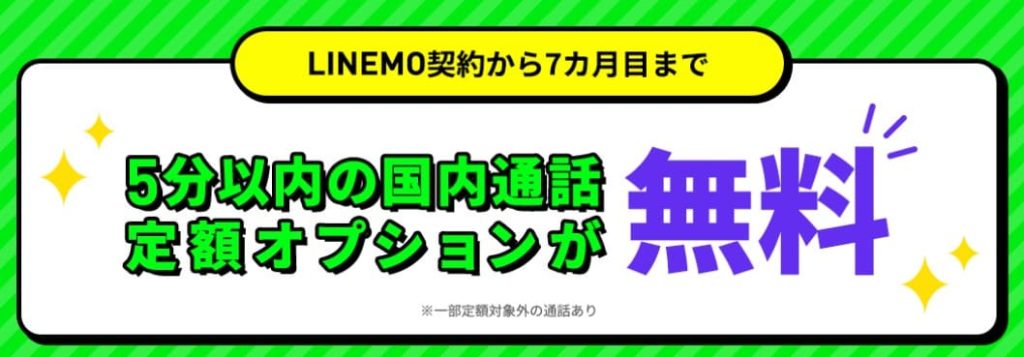 LINEMOは基本データ通信だけでなく通話オプションも充実していますが、現在「通話オプション割引キャンペーン2」を実施中で、契約月から 7か月目まで通話オプションの月額料金が割引 されています。