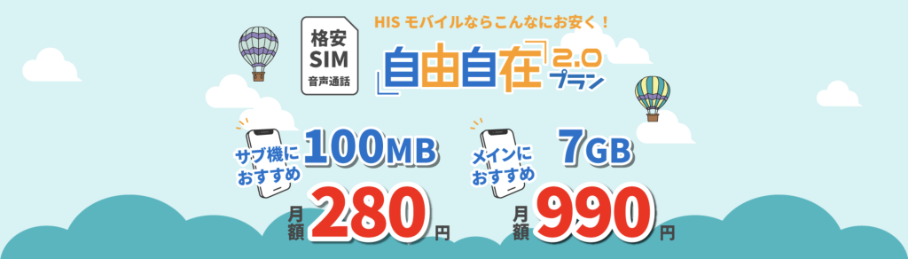 HISモバイルは、100MB/280円〜と格安SIMの中でも最安で利用可能です。