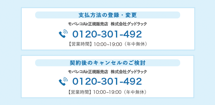 解消しない場合にはモバレコAirカスタマーサポートセンター0120-301-492にご連絡ください。